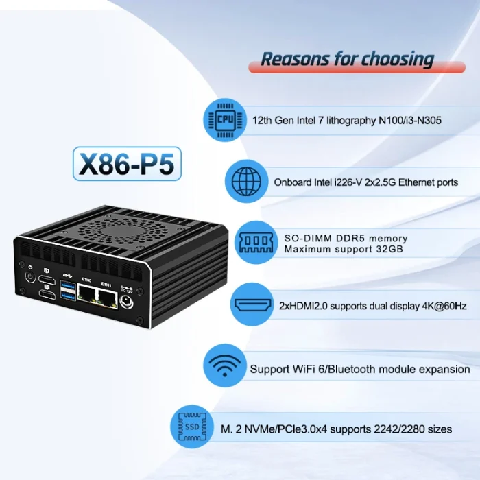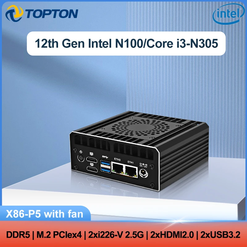 Mini PC Firewall sólido X86 P5 12. a generación Intel i3-N305 N100 enrutador suave 2 * i226-V 2,5G 2 * HDMI2.0 2 * USB3.2 DDR5 4800 PCIex4 NAS DIY