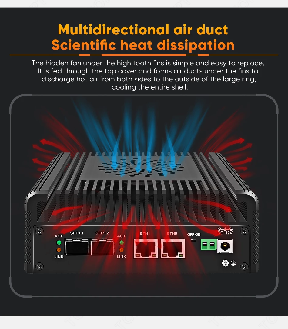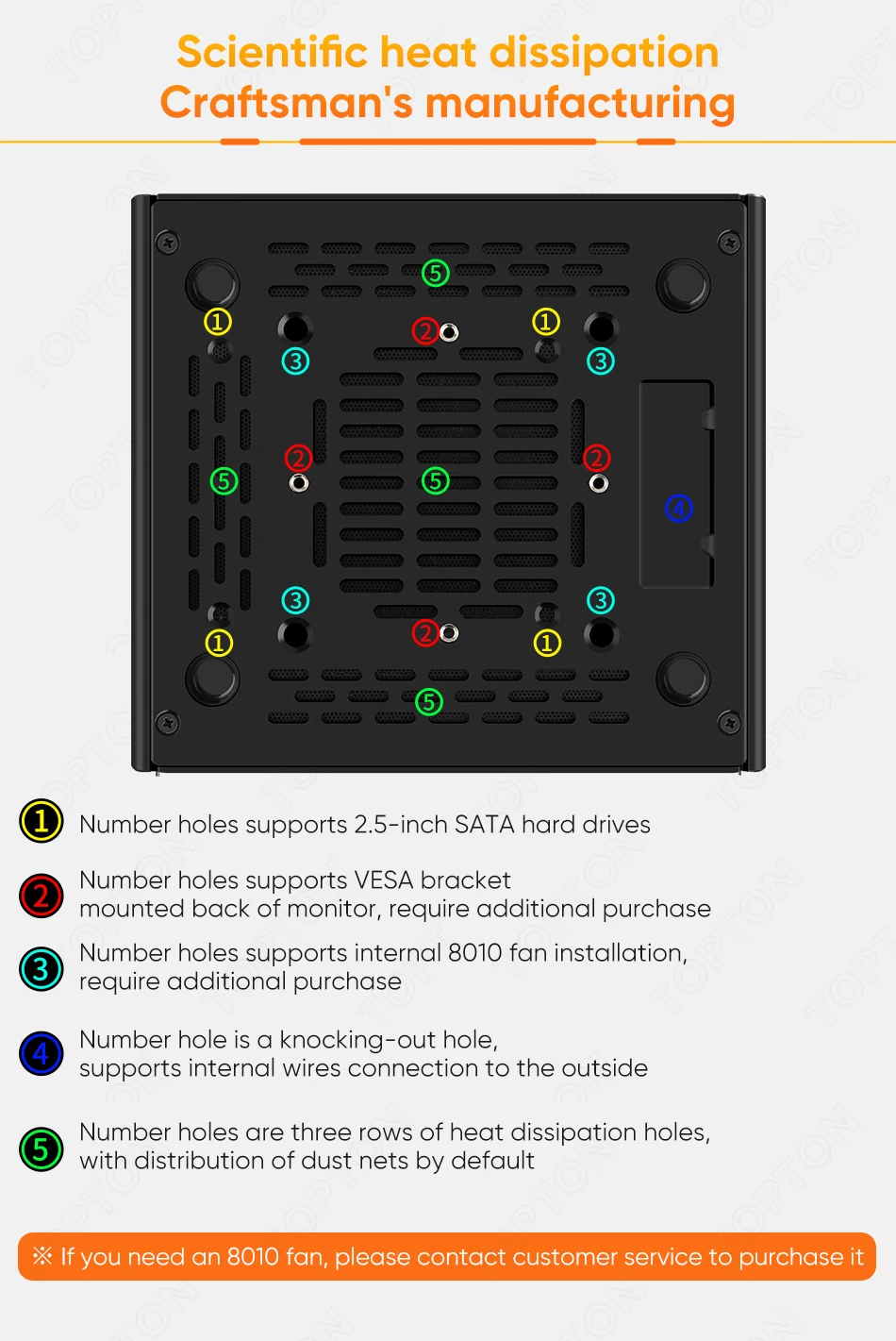 -Innovación: Es flexible cambiar entre sistema sin ventilador y sistema de ventilador.Un ventilador incorporado en una carcasa de aluminio sólido ya con aletas de dientes altos y un bloque de cobre obtiene una disipación de calor mucho mejor para mejorar significativamente el rendimiento de la CPU y el sonido del ventilador es bajo.Puede desconectar el pin del ventilador de la placa base para convertirlo en un sistema sin ventilador si desea un silencio total.
